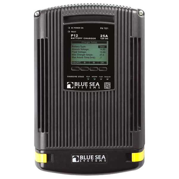 An easy to read and intuitive digital display makes programming the charger straightforward. An available remote allows you to monitor charging status from the nav-station or helm. Blue Sea Systems designed the P12 chargers to work with automatic charge relays (ACR) to maintain battery bank separation while charging. Temperature compensation tailors charge voltage to individual battery condition to maximize their performance. The P12 chargers are available in a 25A model for most boats and 40A model for larger boats. Each charger will handle three battery banks.