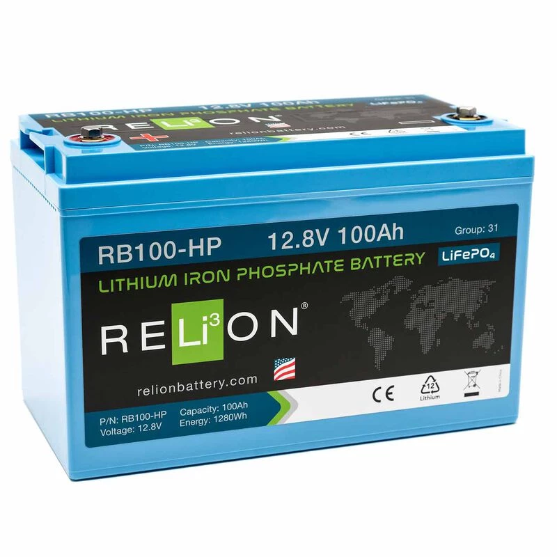 The RELiON RB100-HP is a dual-purpose 12V, 100 Ah group size 31 lithium iron phosphate (LiFePO4) deep cycle battery. RELiON HP Series batteries are high performing dual purpose lithium batteries that can handle both starting and cycling. The RB100-HP has increased peak amps over standard RELiON batteries. This increase in peak amps can be used to start motors, electric start generators and other high amp draw devices. After starting, the battery can double as a house battery providing power for peripherals, accessories and other onboard needs.